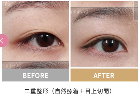 | 「自然癒着法」は、糸で留めるだけでなく、まぶた内部の組織が自然にくっつくよう誘導します。時間の経過とともに組織が癒着し、より自然で深みのあるラインが定着しやすくなるのが特徴です。 |