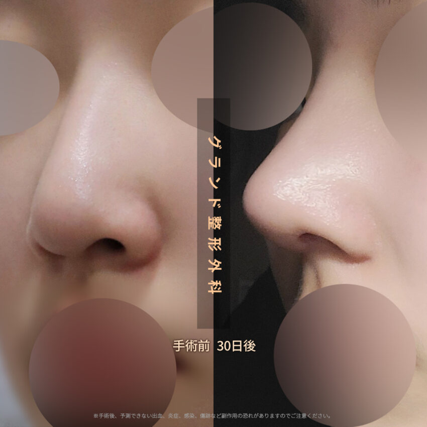プロテーゼや耳介軟骨を鼻に挿入して高く見せます。プロテーゼや耳介軟骨の長さや形によって印象が大きく変わる方法です。
