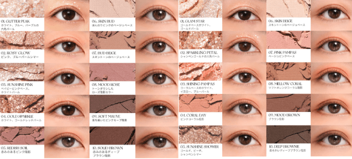 アイシャドウ+グリッターの10色入パレットで、パーソナルカラーや季節によって色味が選べます。高発色で映える目元が作れると韓国でも大人気!ただ、最新作は出ていないので後で詳しくご紹介しますね。