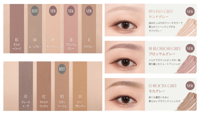 先に販売されていた「ダスキーローズ・ムーングレー・グレーストープ・マイルドウッディ・モダンベージュ・メリーブロンディ・ハンオルブロウフィクサー」に加えて、3色が新登場です。