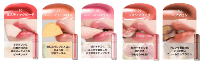 フルーツから着想を得て開発された「ザ ジューシーラスティングティント レアシリーズ」です。新色として5色が仲間入りしています。