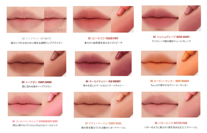 ロムアンドの新作カラーリップマットは、プライマー+8色のカラー展開です。
