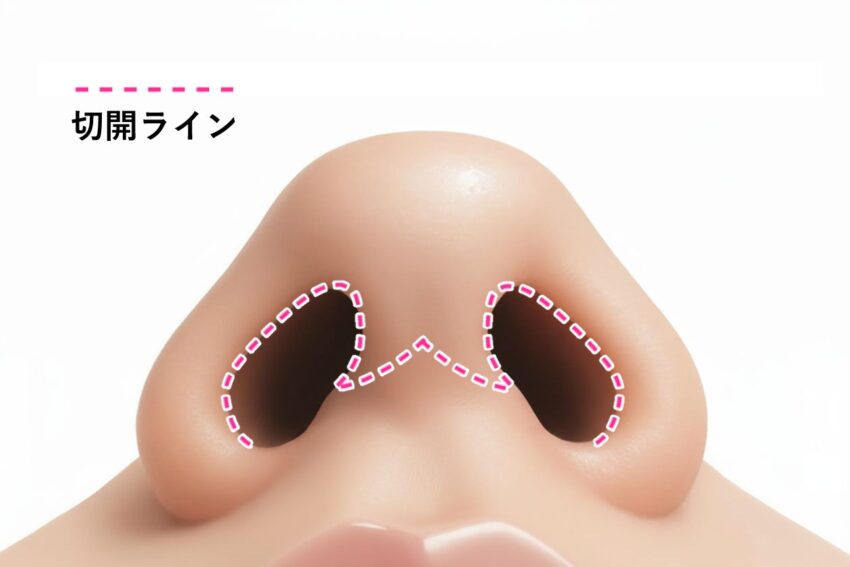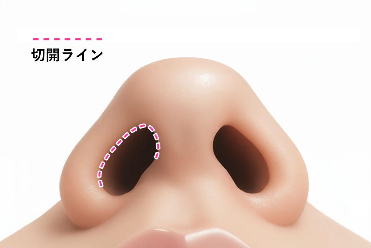 ✅️非開放型(クローズ法)では、主に「鼻腔内」を切開して施術を行います。粘膜の部分を切開するため傷が早く治りやすく、ダウンタイムを短く抑えられる点が大きな特徴です。