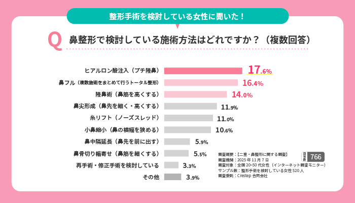 実際に施術を検討するとなると、回答結果はやや分散された傾向にあるものの、1位はヒアルロン酸注入(17.6%)という結果になりました。鼻整形は切開を伴う施術も多いため、まずは手軽に行えるプチ整形から試してみたいと思っている方が多いようです。
