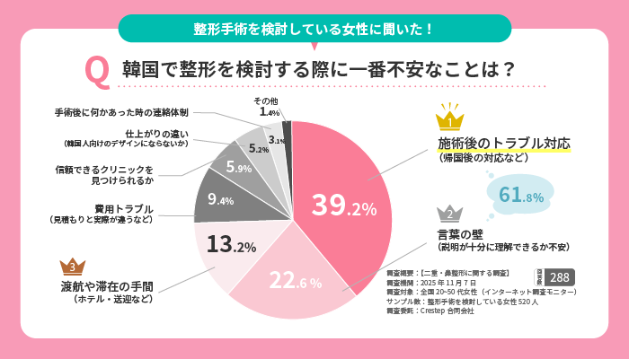 一方で、今回の調査では「施術後のトラブル対応」と回答した人が39.2%ともっとも多く、韓国での施術における大きな不安要素となっていることが分かりました。