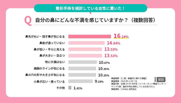 これらの結果から、多くの方が単に鼻を高くしたいというよりも、鼻先の形状や鼻筋のラインなど、顔全体の印象に直結する要素に強い悩みを抱えていることがうかがえます。
