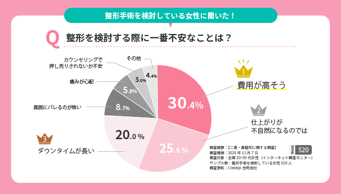 鼻整形における不安としては、「費用が高そう」30.4%・「仕上がりが不自然になるのでは」25.8%・「ダウンタイムが長い」20.0%という声が上位を占めています。