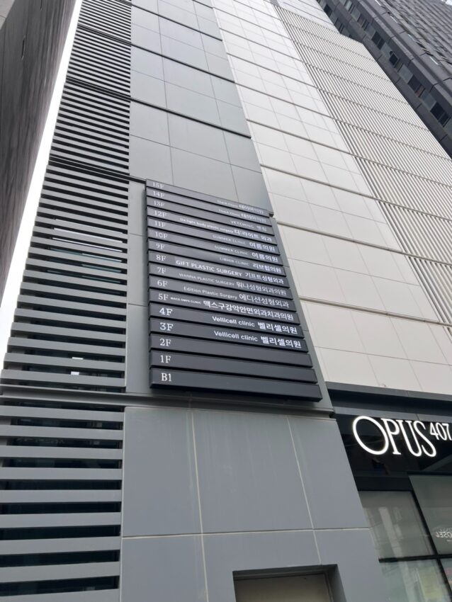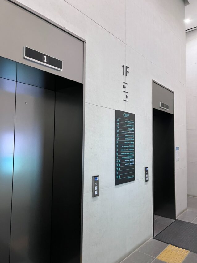 SAMSUNGと書かれたビルの裏側にまわると「OPUS407」と書かれたビルがあります。そのビルの14階がクリニックの受付になっているのでエレベーターで上がります。