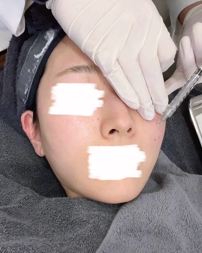 針が肌に入るときは「チクッ」とし、あまり痛くないのですが、薬剤が注入される際にワクチンを打つ時のような「ズーン」とした痛みがありました。とくに目の下に近づくと痛みが少し強くなっていきました。施術自体はテンポよく進むので、痛みに耐える時間は少なくて良かったです。「手打ちジュベルック」は痛いと聞いていましたが、痛みに弱い私でも、先生がお上手だからか思っていたより痛くない印象でした。