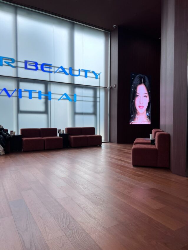 スタッフの方に案内されて、院内中央の不思議な空間の中でAI診断の機械を用い自分の顔の撮影を行います。この時「目は絶対に開けないでください」と言われました。