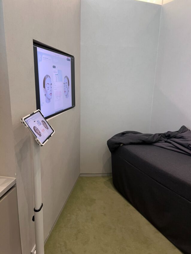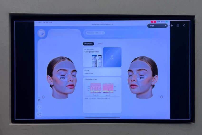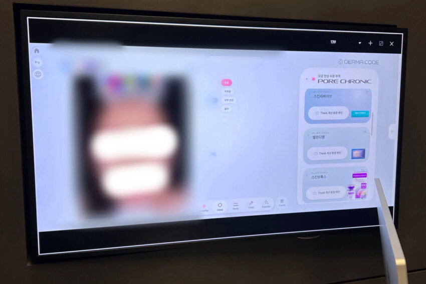 施術室の中には自分の名前と施術内容・効果説明・施術部位などが書かれた美容カウンセリング用AIシステムのモニターがあります。