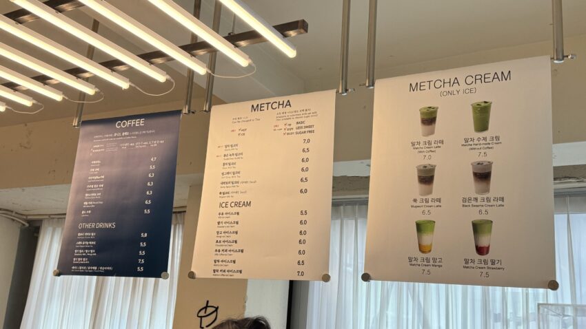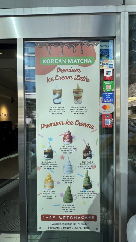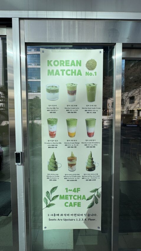 明洞エリアの上側に位置するMETCHA明洞本店は、抹茶をメインにしたドリンクやスイーツが楽しめるカフェ。
