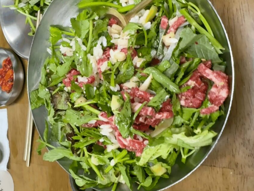 シャキシャキで新鮮なセリとユッケや牛スープなどの組み合わせは癖になる美味しさです◎