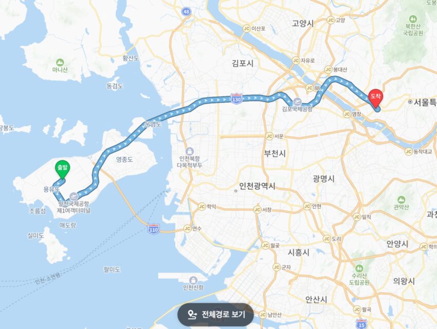 仁川空港を出発地として、弘大入口駅まで行く経路です。