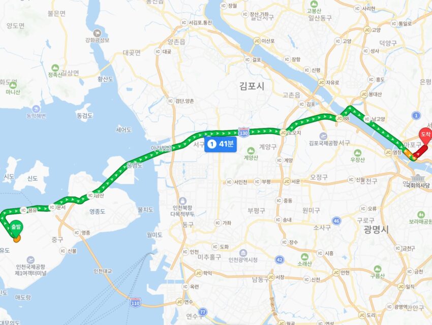 仁川空港から弘大までタクシーを利用した場合、所要時間はおよそ 40分〜60分。高速道路の混雑状況や出発時間帯によって前後することがあります。
