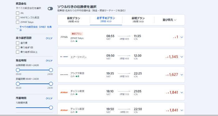 条件に合うフライトの一覧が表示されるので、航空会社や時間・料金などを見て最適な航空券を予約してください。航空会社や発着時間で絞り込み検索もできます。