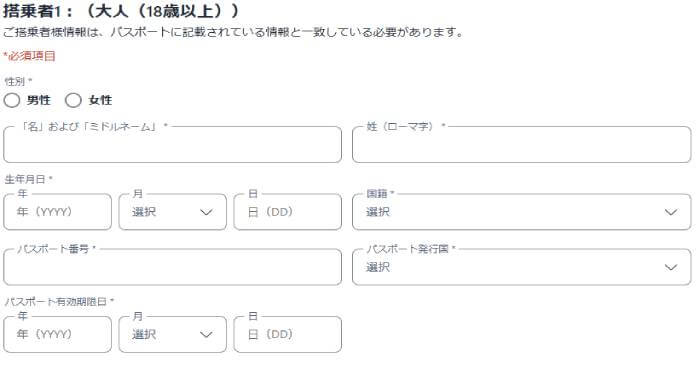 次に出発地・目的地・滞在地・人数・部屋数・出発日・現地出発日・チェックイン日・チェックアウト日を入力します。
