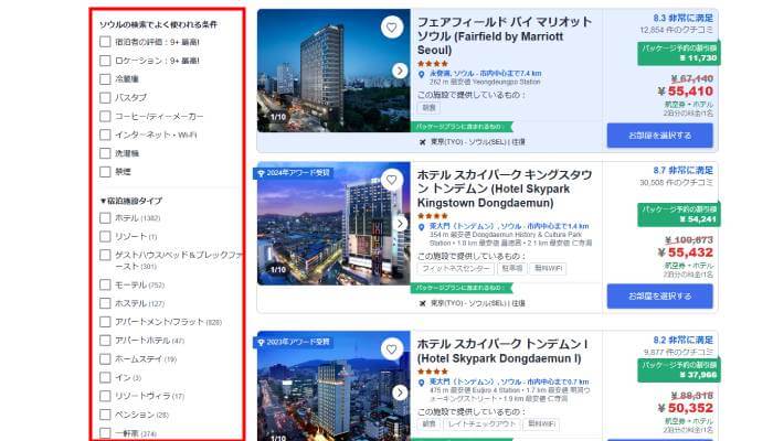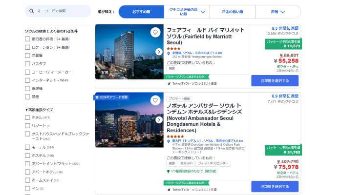 韓国の格安航空会社(LCC)との連携も強いから、ホテルも航空券も安く予約できるんだよ!