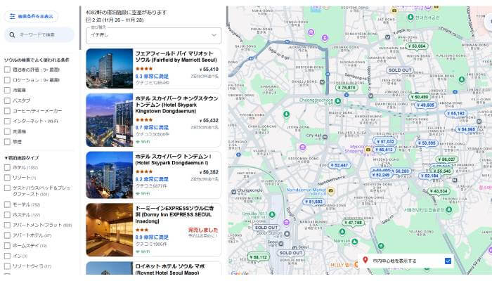 ホテル情報一覧と地図上にホテルの料金が表示されているので、訪れたい観光地やエリアの周辺からすぐにホテルを見つけることができますね。