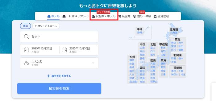 航空券・ホテルのセット予約ボタンから「行き先・日程・人数」などを入力すると、条件に合う予約可能なリストを表示してくれます。