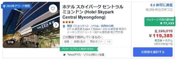 例えばこちらの韓国明洞(ミョンドン)のホテルスカイパークセントラルのセットプランをみてください。