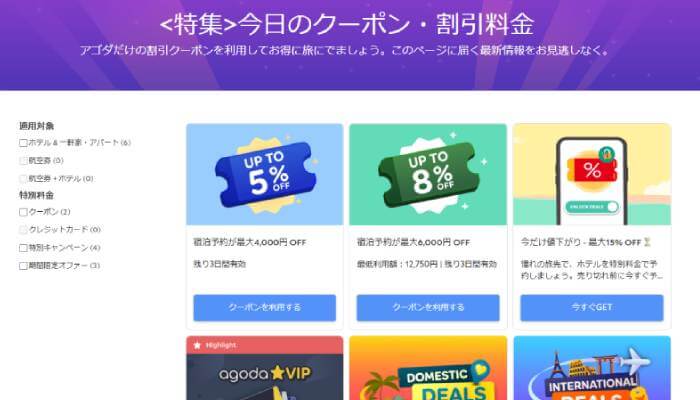 Agodaにはお得に旅行の予約ができるクーポンが常時用意されています。