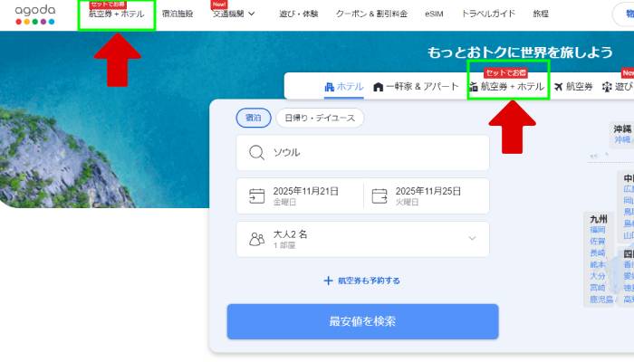 Agodaはホテルと航空券のセットを検索・予約できます。