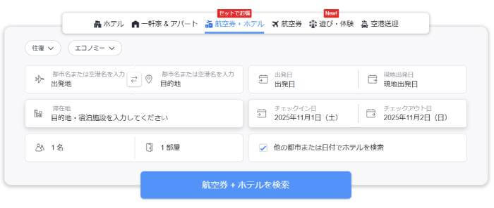 別々に予約をするときは「航空券を検索して予約、次にホテルを検索して予約」と時間も手間もかかります。