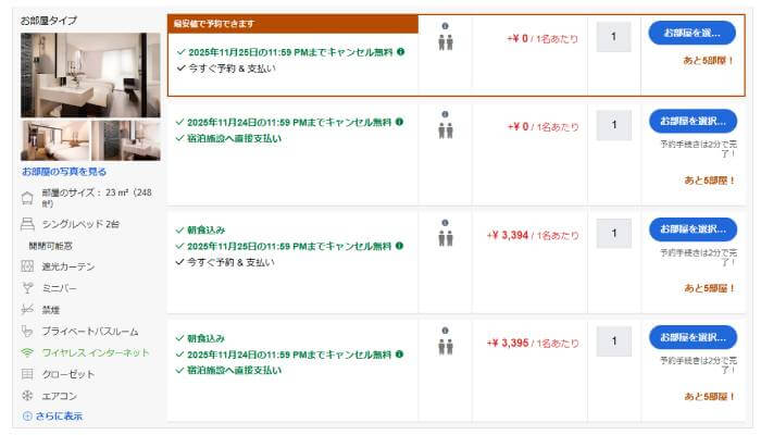 空いている部屋が表示されるので、ベットタイプやお部屋のサービス・キャンセルに関する情報などもよく確認してもう一度「お部屋を選択する」をクリックしてください。