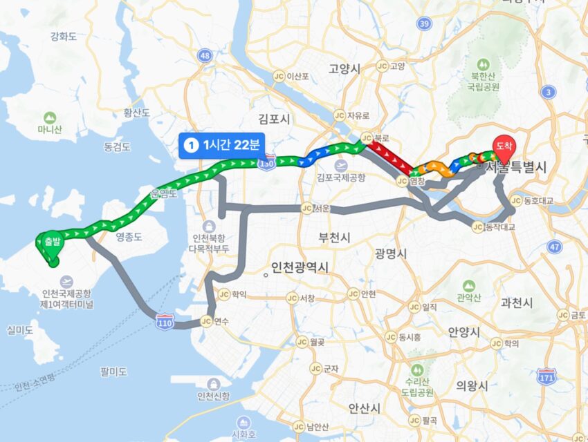 仁川空港から東大門歴史文化公園駅(DDP)までは、通常タクシーで約70〜90分ほど。もちろん時間帯や渋滞状況によって前後してしまいます。