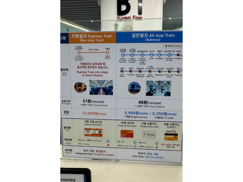 空港鉄道A’REXはソウルまでノンストップで行ける直通列車と、ソウル駅まで一番安く行ける各駅の一般列車があります。