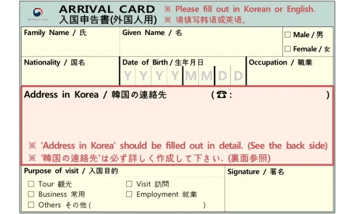 入国カードには、氏名・性別・生年月日・韓国にいる間の滞在先情報などを記入します。