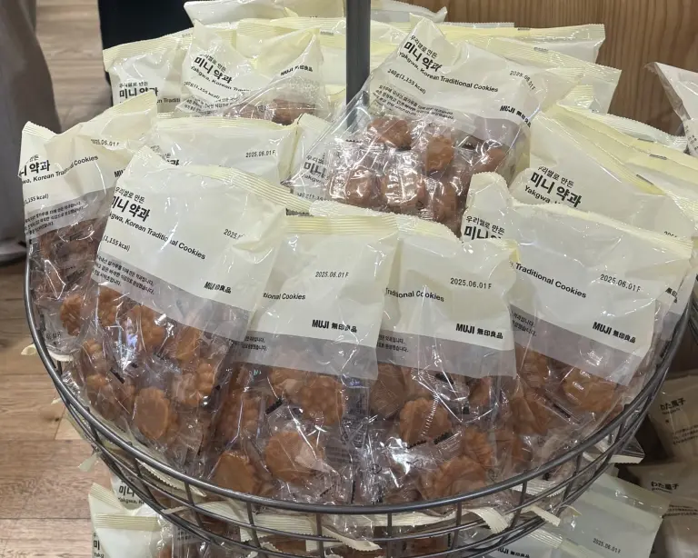 韓国の無印良品では、現地ならではの素材や味を活かした、ユニークなお菓子がそろっています。特に人気なのが、韓国の伝統菓子を現代風にアレンジした商品たち。素朴でやさしい味わいは、どこか懐かしく、世代を問わず親しまれる味です。見た目もかわいらしく、日常のおやつにはもちろん、日本へのお土産としても高く評価されています。