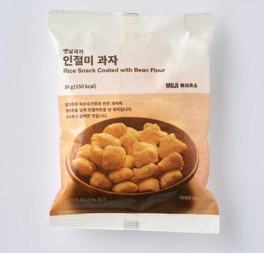 次にご紹介するのが、「インジョルミ菓子」。インジョルミとは、きな粉をまぶした餅のことですが、無印のインジョルミ菓子は、米粉ととうもろこし粉を使って焼き上げた軽いスナックに、香ばしいきな粉をたっぷりまぶしたもの。口に入れるとふわっと広がる素朴な甘みと、サクサクとした食感が特徴です。